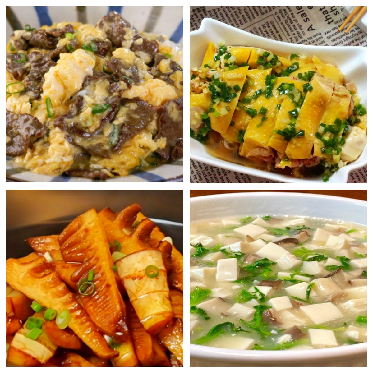 滑蛋嫩牛 、葱油鸡、油焖嫩笋、荠菜豆腐羹