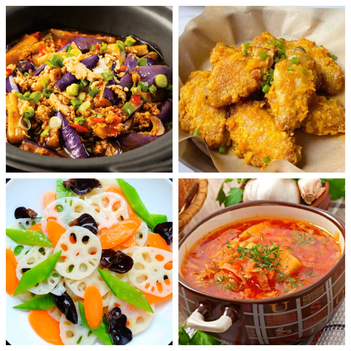 咸鱼茄子煲、蒜香鸡翅、荷塘小炒、罗宋汤