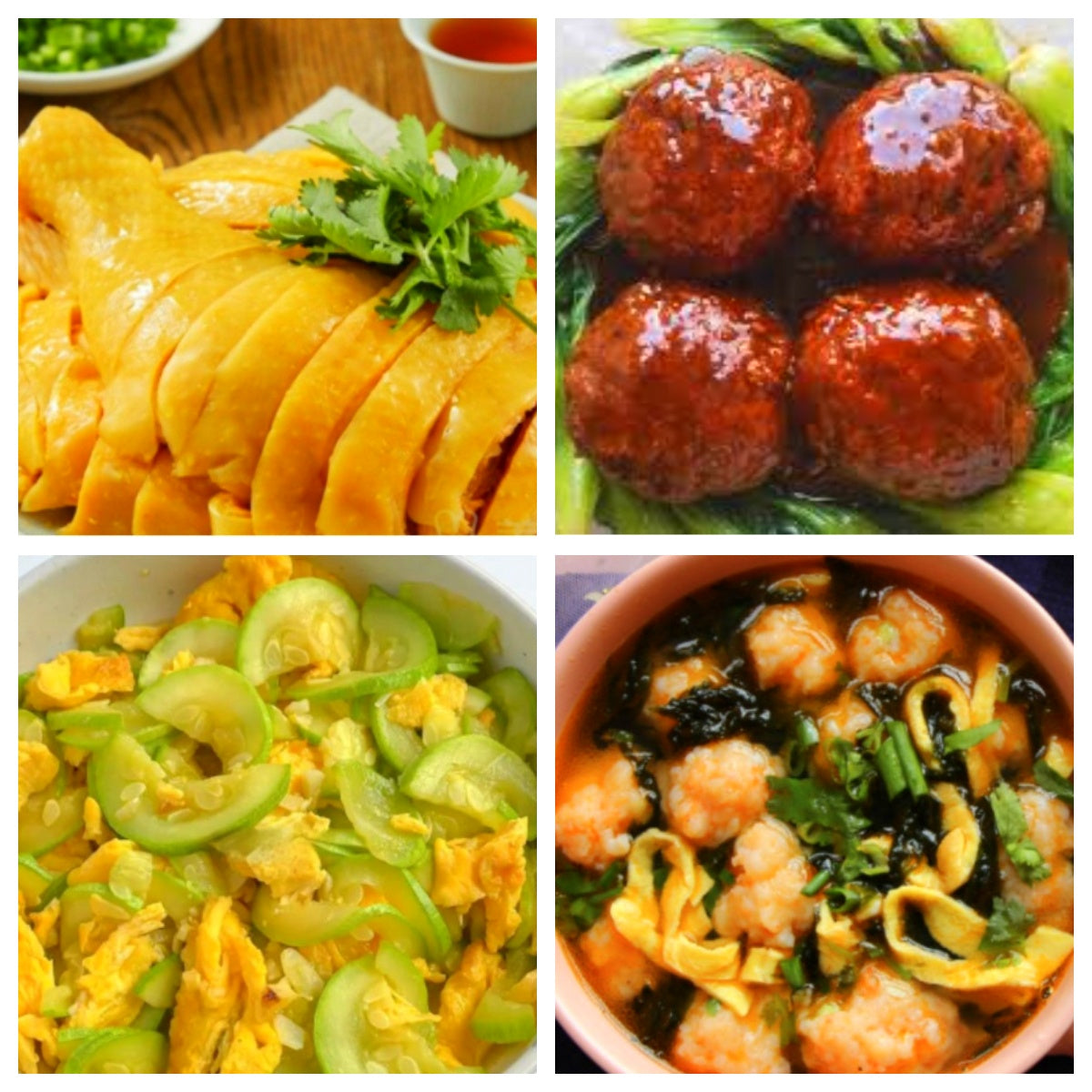 上海三黄鸡、红烧狮子头、西葫芦炒鸡蛋、虾滑紫菜汤