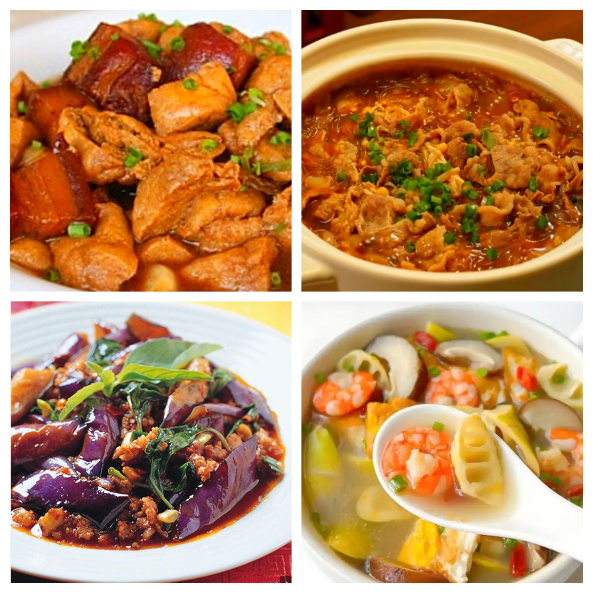 油豆腐烧肉、沙茶肥牛煲、九层塔茄子、春笋鲜虾汤
