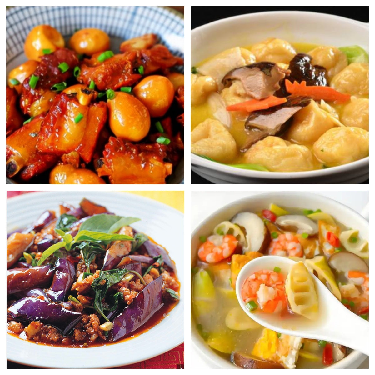 鹌鹑蛋烧排骨、上海鱼面筋、九层塔茄子、春笋鲜虾汤