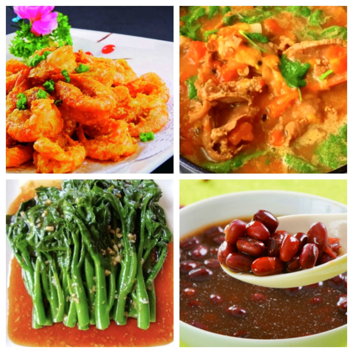 咸蛋黄大虾、酸汤百香果金针菇肥牛、炒时蔬、红豆莲子羹
