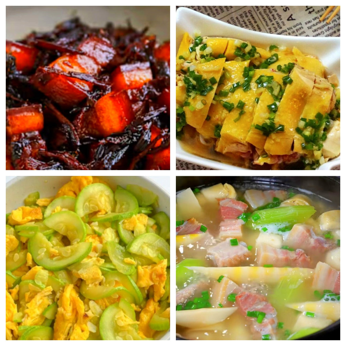 梅干菜烧肉、葱油鸡、西葫芦炒鸡蛋、腌笃鲜