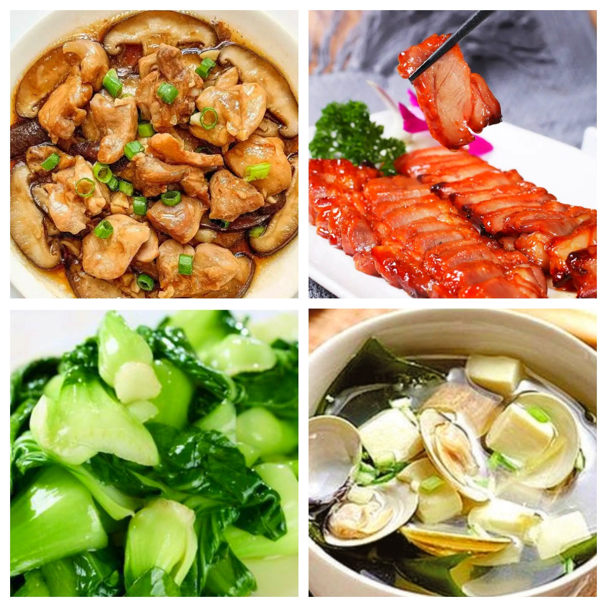 香菇蒸鸡、叉烧、清炒上海青、文蛤豆腐汤